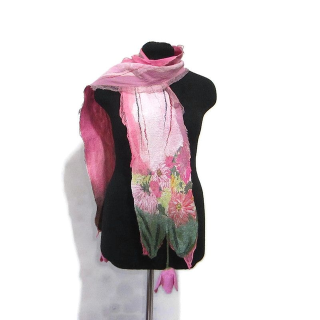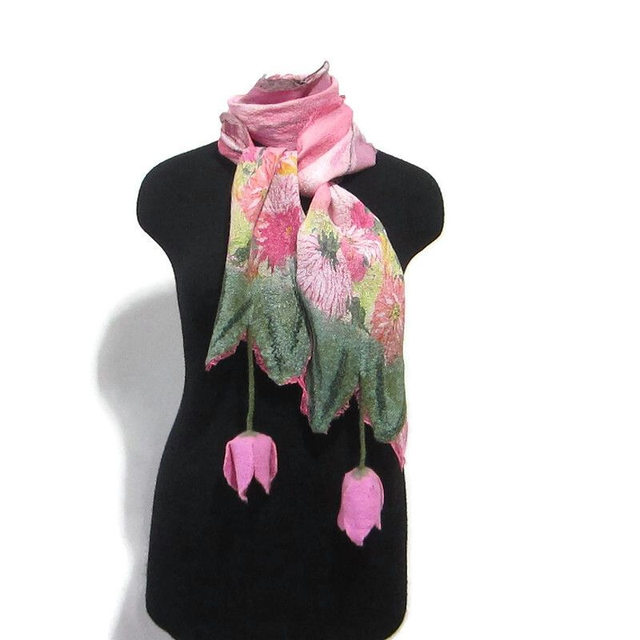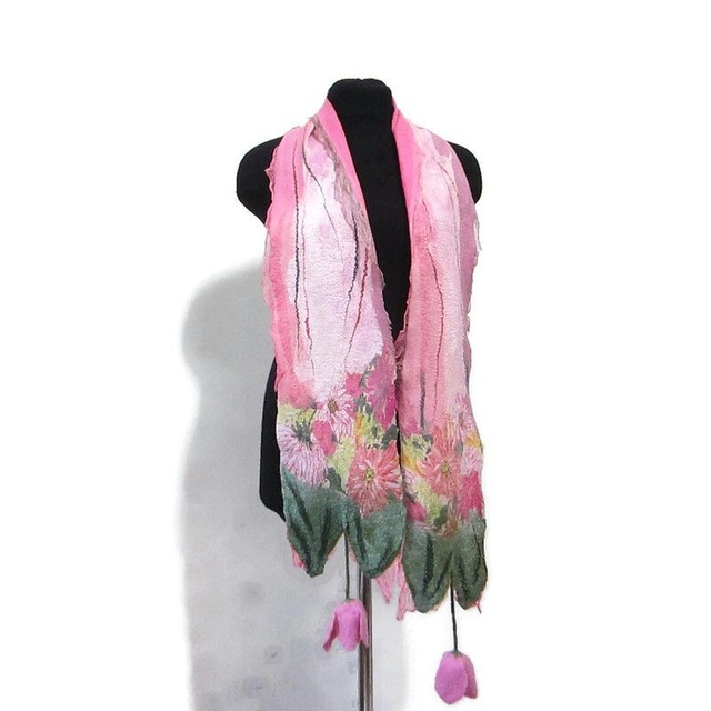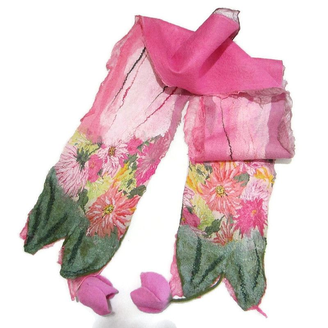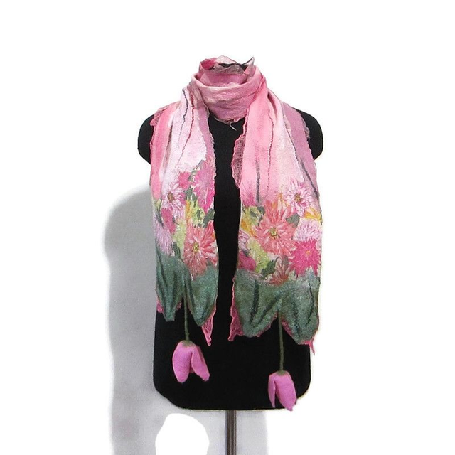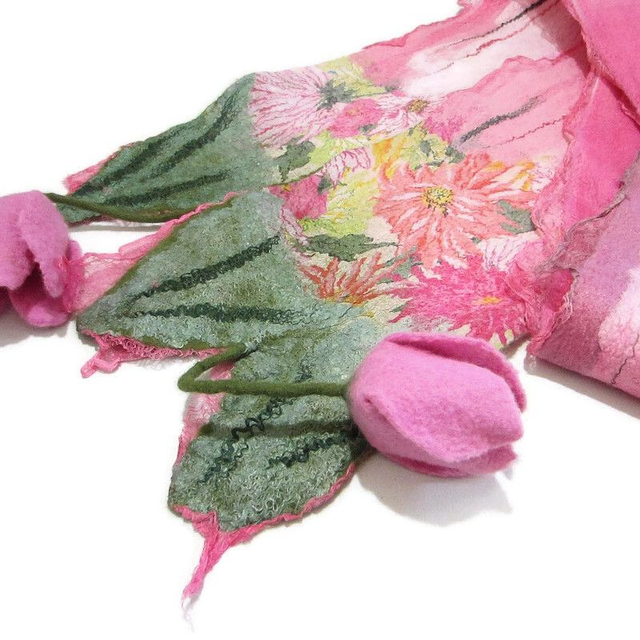 Sciarpa rosa brillante in lana merino e seta, decorata con tulipani infeltriti a mano.