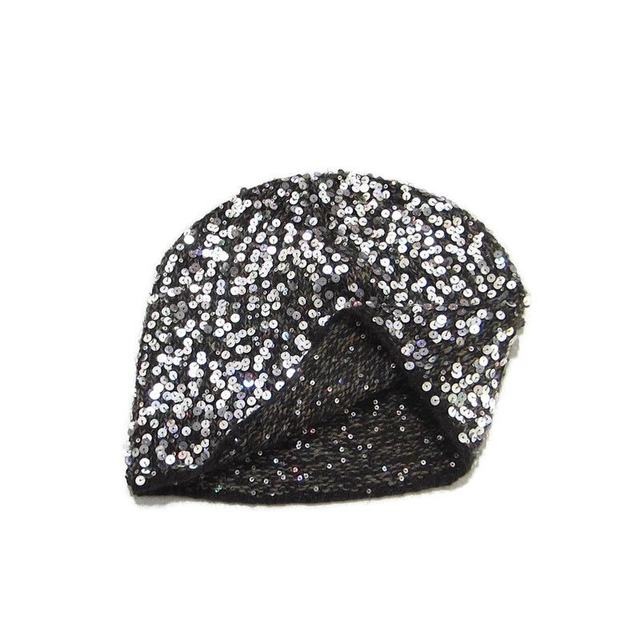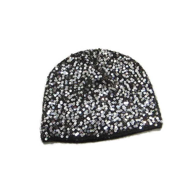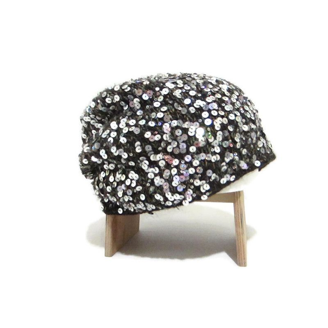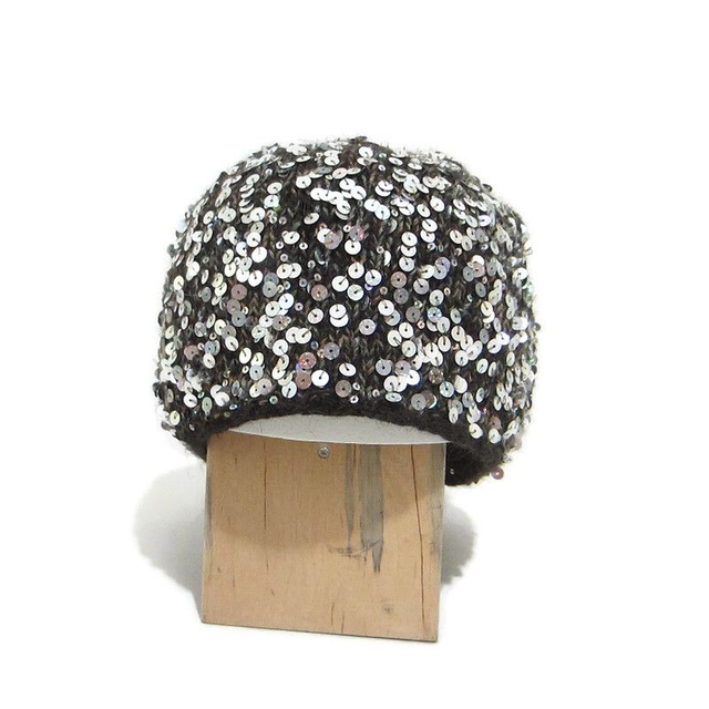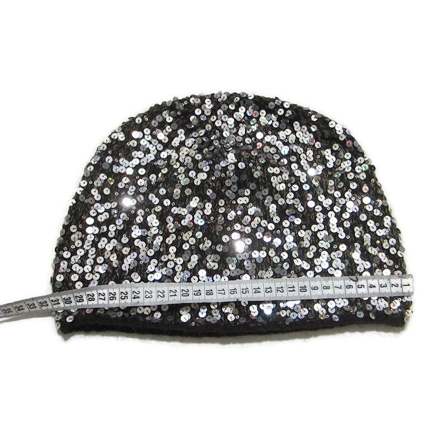 Un morbido cappello in lana e cotone lavorato a mano con paillettes. Misure: 57-62 cm.