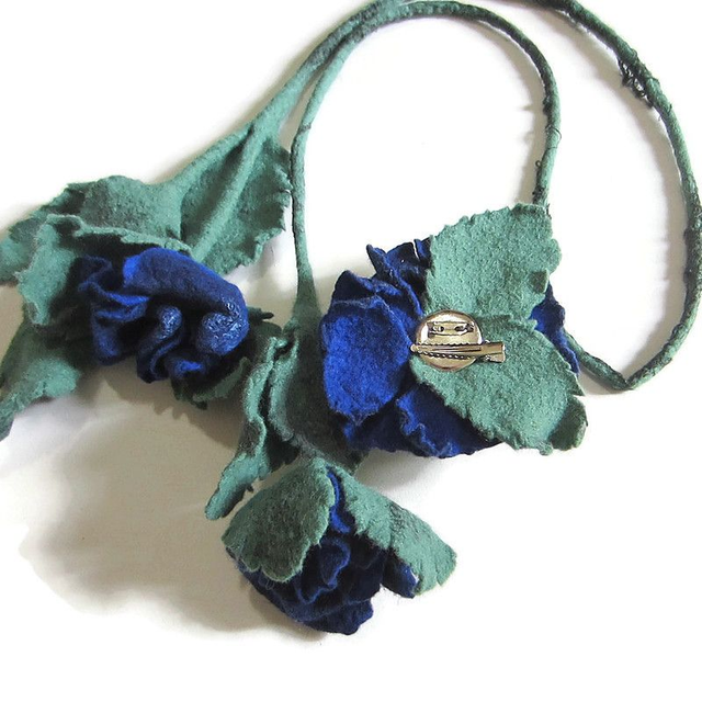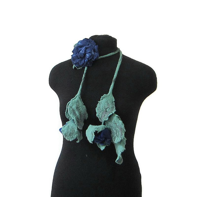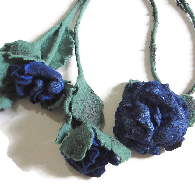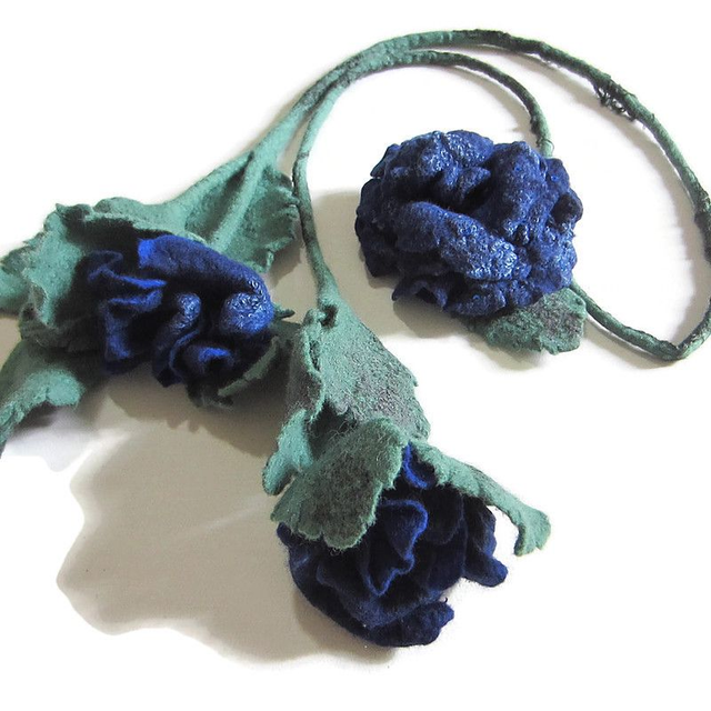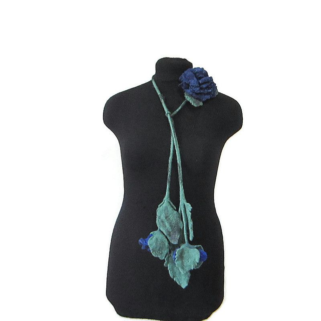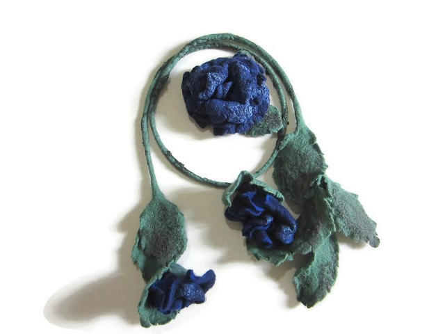 Questa collana a forma di stelo di rosa con boccioli e foglie è realizzata in lana merino. Spilla rosa blu 11x13 cm con paillettes, realizzata in lana merino, attaccata ad una collana o separatamente come desideri. Infeltrimento, fatto a mano.