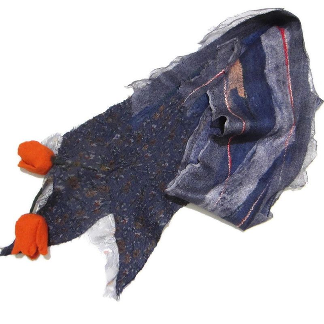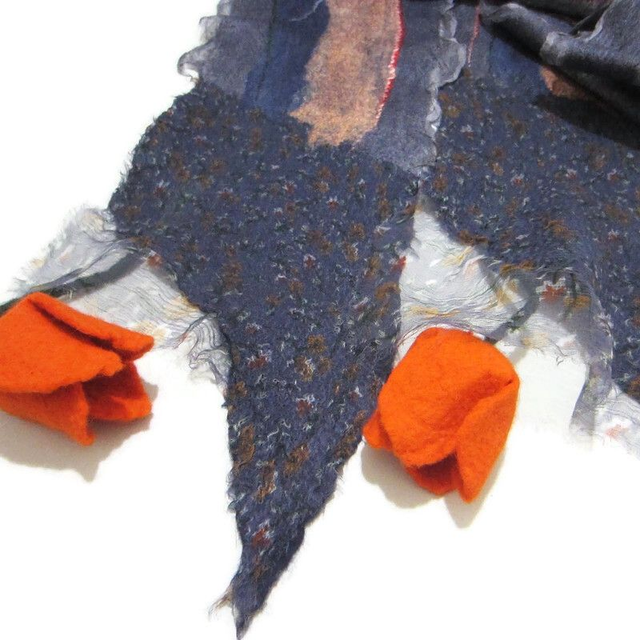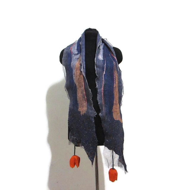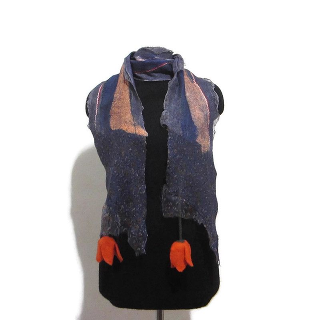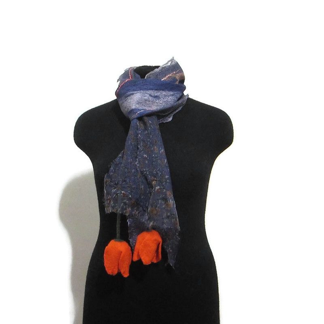 Sciarpa feltro di lana seta blu lunga calda con fiori tulipani arancia infeltrimento fatta a mano