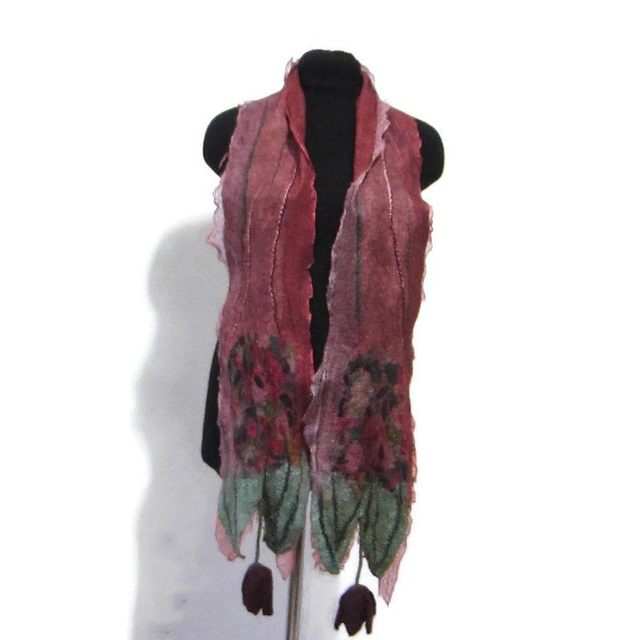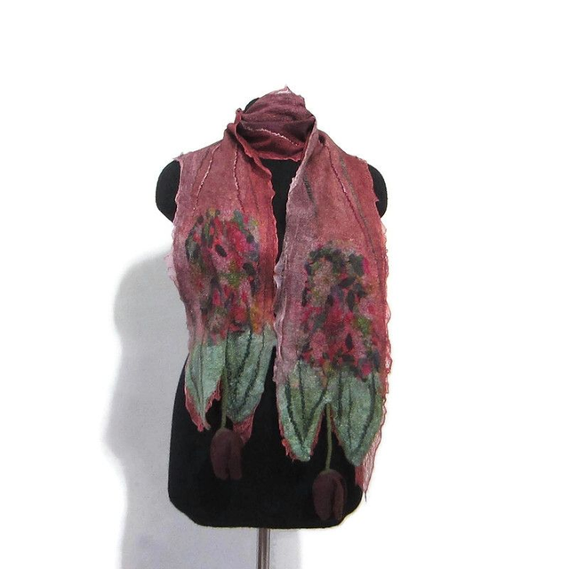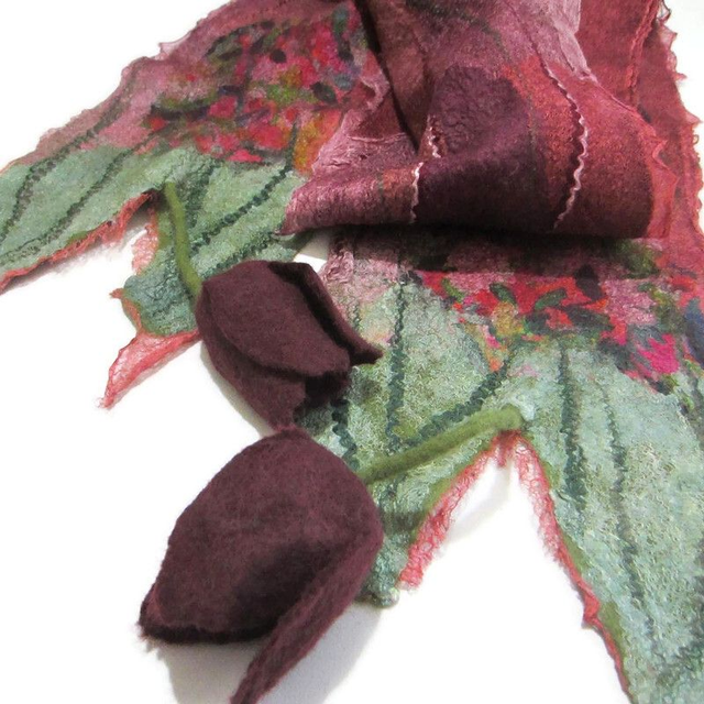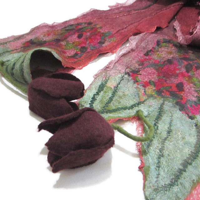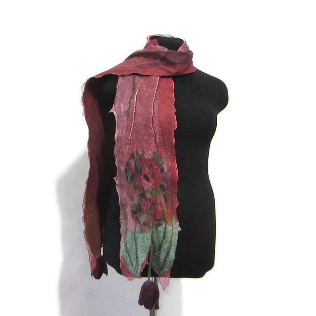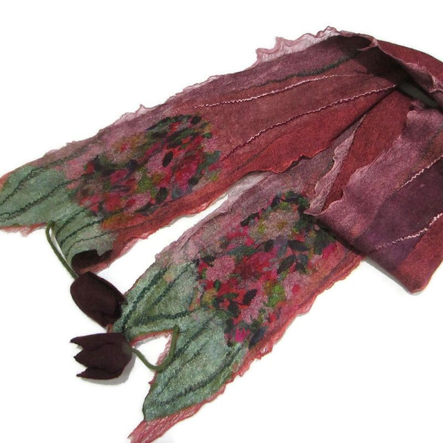 Sciarpa feltro di lana seta Sciarpa Borgogna lunga calda con fiori tulipani infeltrimento fatta a mano