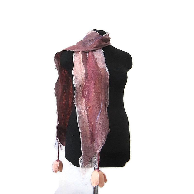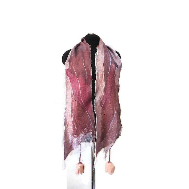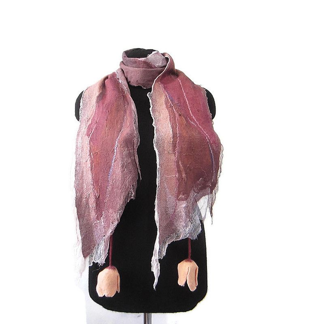 Sciarpa lana merino seta infeltrita fiori tulipani Sciarpa rosa lunga con paillettes donna fatto a mano