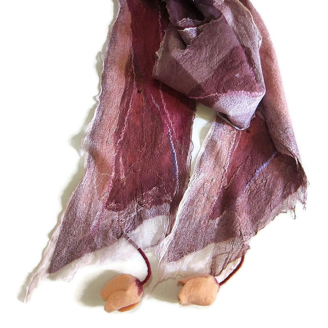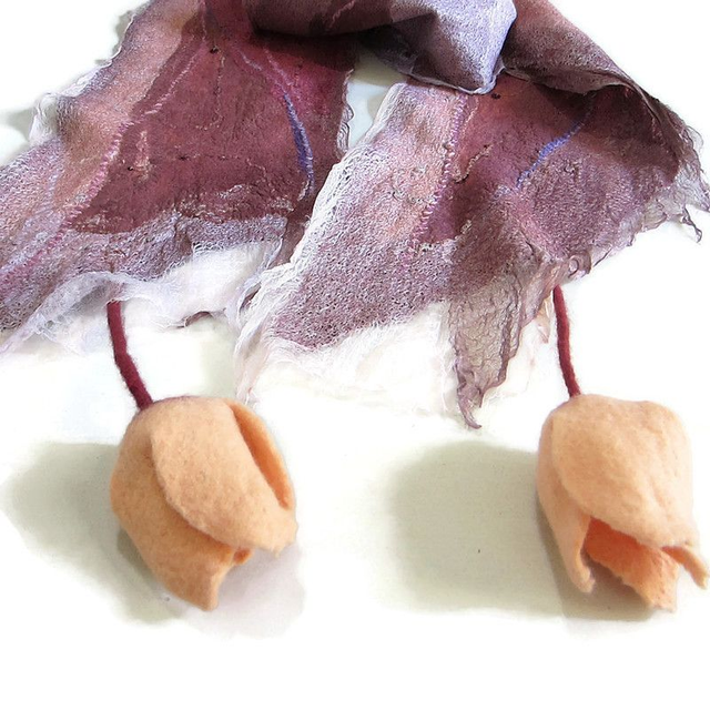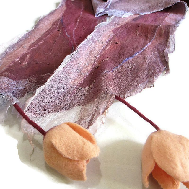 Morbida e calda sciarpa realizzata in pregiata lana merino su base di seta e ricoperta da diversi tipi di seta. La sciarpa è decorata con paillettes. Le estremità della sciarpa sono decorate con tulipani di lana fatti a mano.
