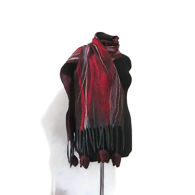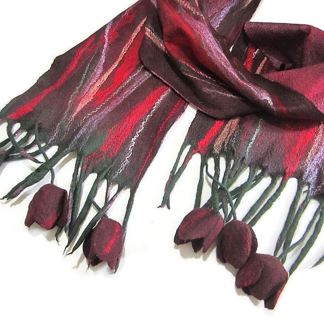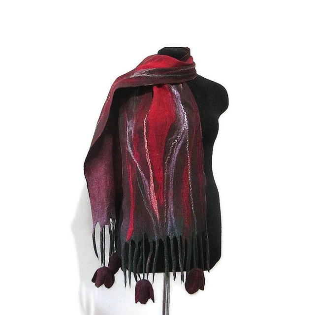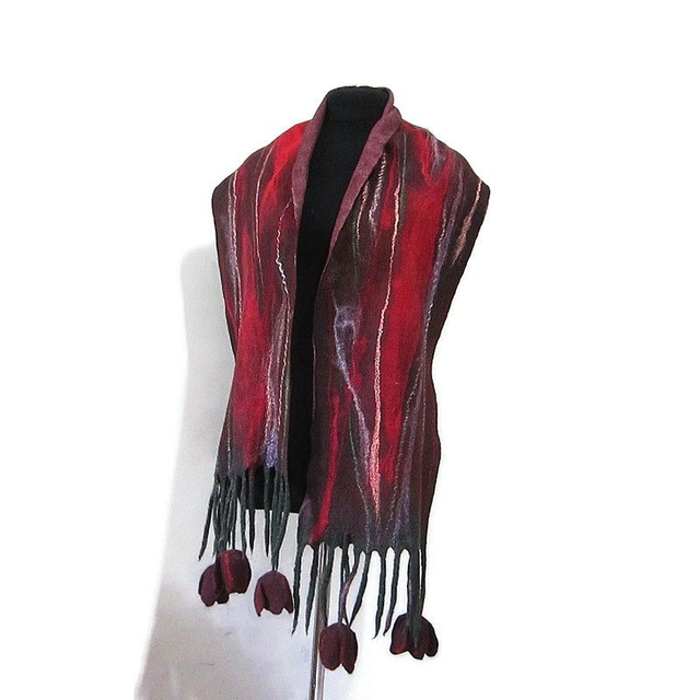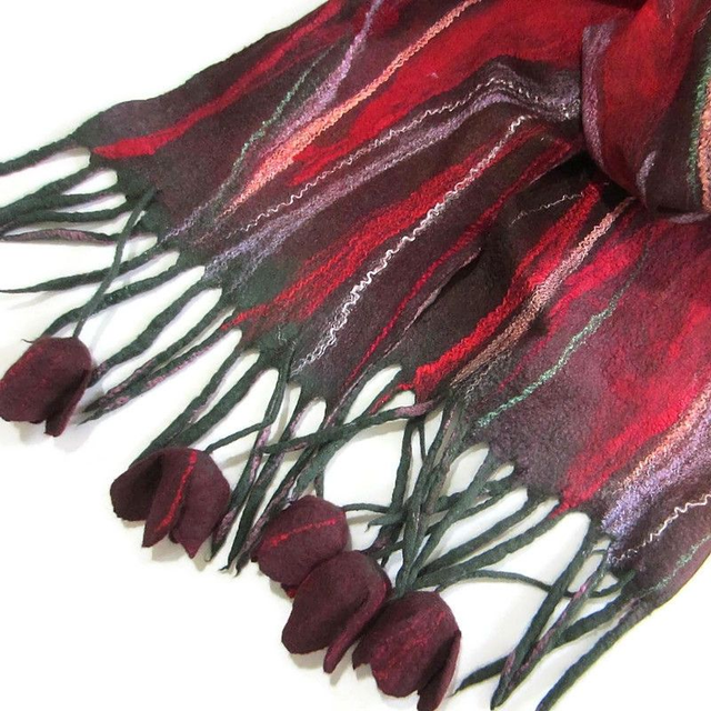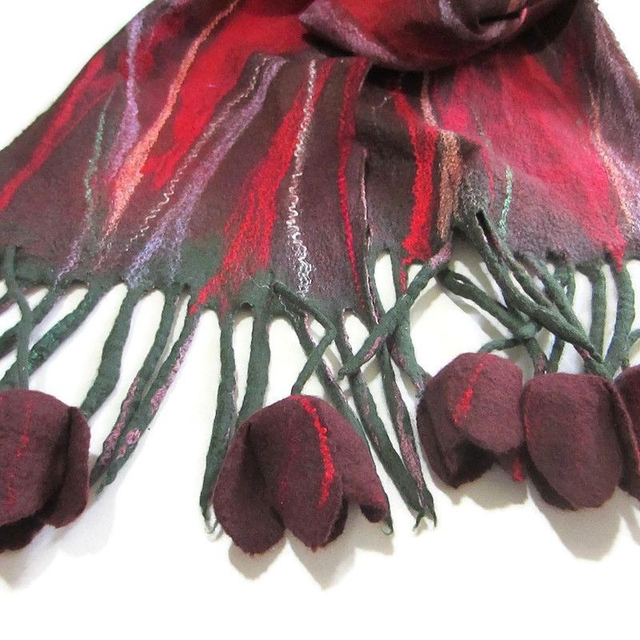 Sciarpa rosso feltro lana merino seta infeltrita fiori tulipani Sciarpa lunga calda donna fatto a mano regali unici per le donne