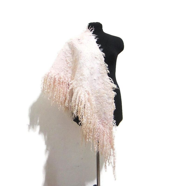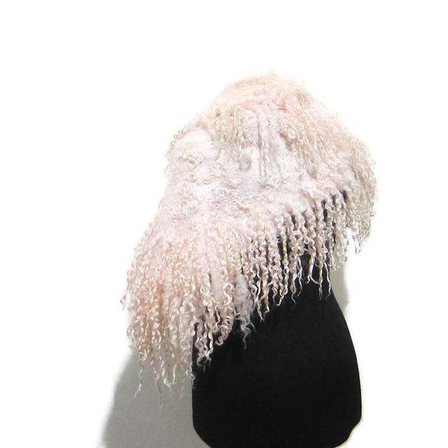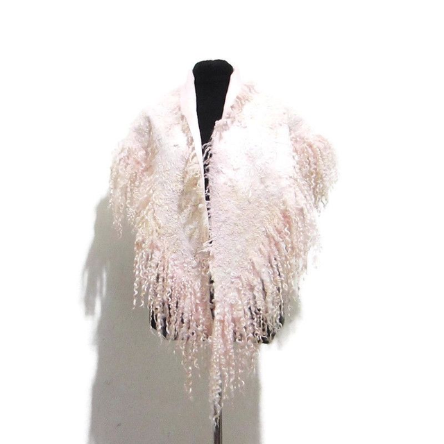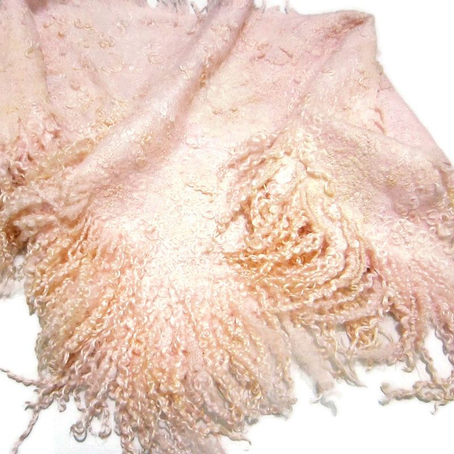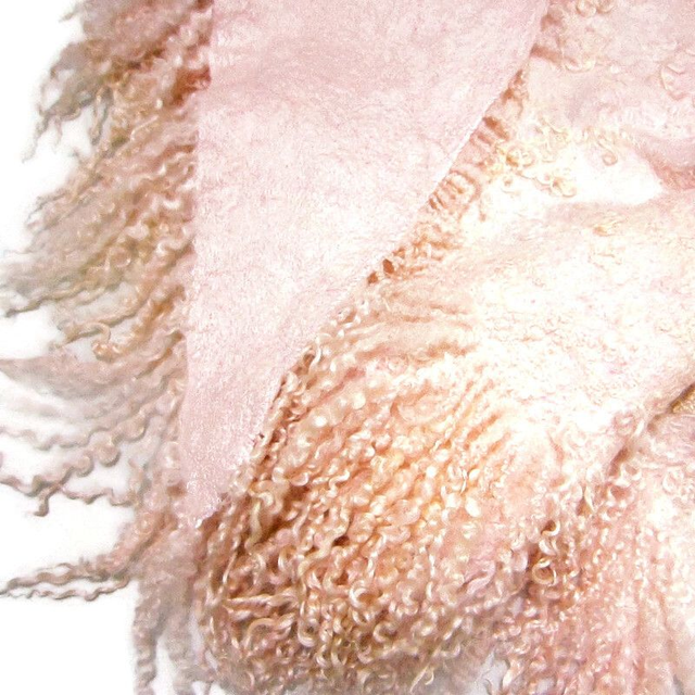 Uno scialle in lana merino molto caldo su base di seta. Lo scialle è ricoperto di pelo di agnello tosato proveniente da diverse razze di pecore. Lana tosata di alta qualità. Lo scialle è rosa perla e tinto a mano. Infeltrito e fatto a mano. Le dimensioni senza riccioli sono 174 x 64 cm. Lo scialle è perfetto sopra un cappotto, una giacca o un cappotto.